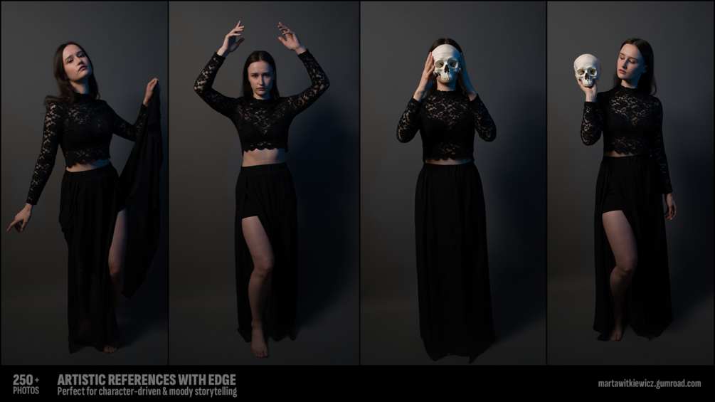 Whether you're illustrating characters with a darker edge, exploring themes of elegance and mortality, or simply looking for inspiration in light, form, and gesture, this pack was made to spark your imagination.