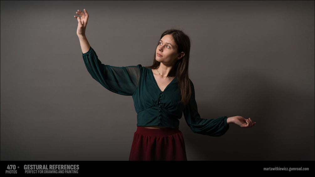 The set includes portraits from every angle, providing you with a comprehensive view of the features. This allows for a deeper understanding of head structure and facial expressions. You’ll also find a variety of beautiful arms and hands gestures accentuated by semi-transparent sleeves of the green garment.